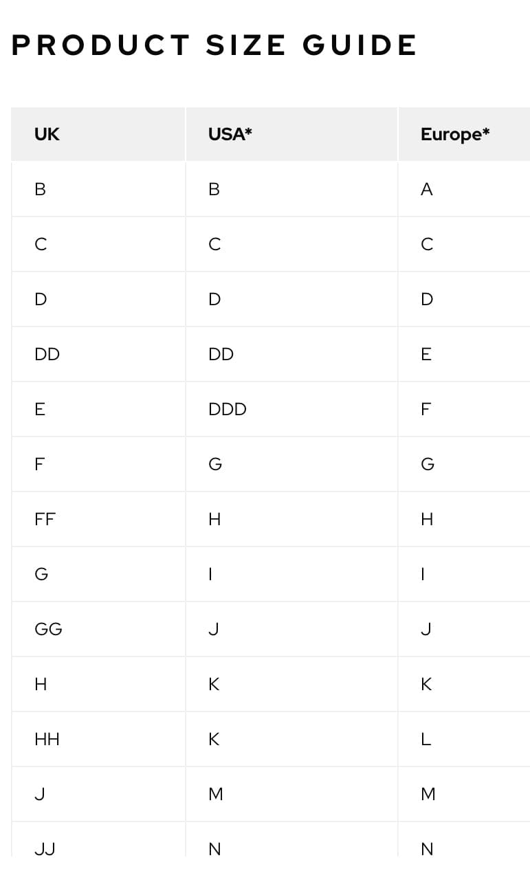 | UK / US | 30 | 32 | 34 | 36 | 38 | 40 | 42 |